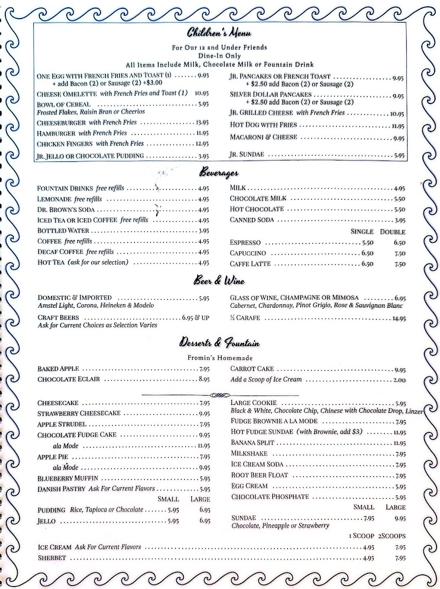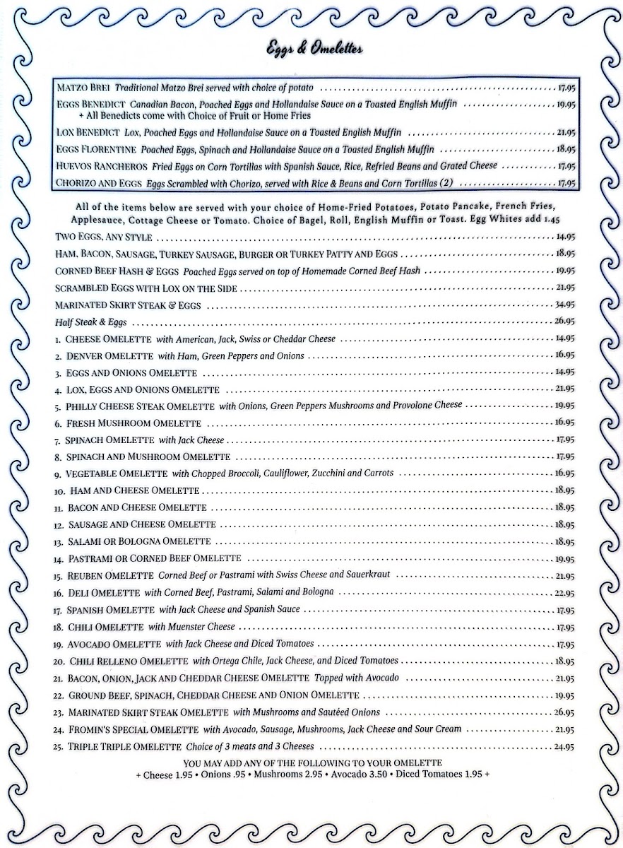 The menu at Fromin's offers a variety of traditional deli and breakfast items, catering to a diverse range of tastes suitable for breakfast, lunch, or casual dining. The menu is structured into several key categories to help visitors easily navigate their options.
