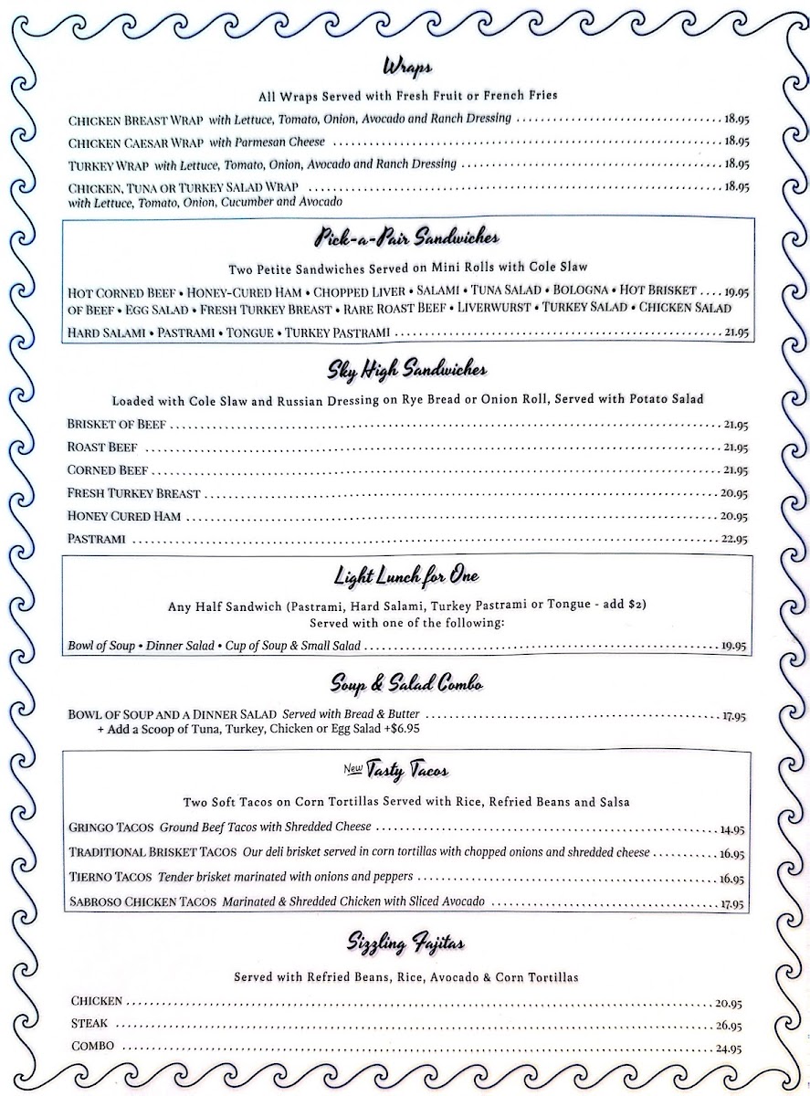 Soups and Combos: Popular options include Matzo Ball Soup, Chicken Soup, and combinations like the Chicken Soup and 1/2 Sandwich Combo, providing comforting and hearty light meal choices.